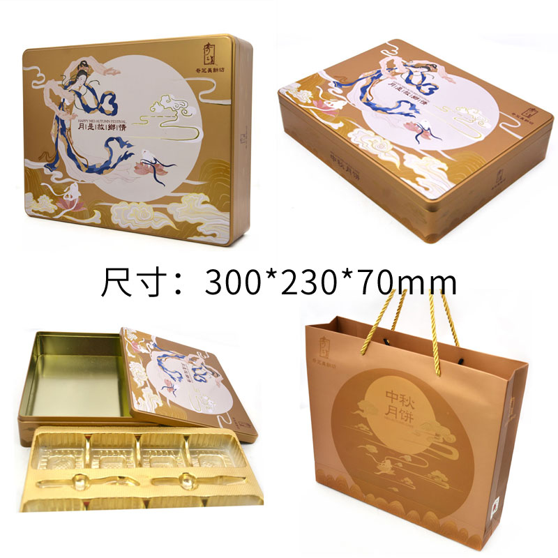 這款八粒裝月餅鐵盒采用國(guó)產(chǎn)馬口鐵制成,厚度是0.23mm,尺寸是300*230*70mm;結(jié)構(gòu)是三片式天地蓋,蓋內(nèi)卷。月餅品牌LOGO進(jìn)行3D雕刻處理;其采用專色印刷。其外部過(guò)光油,內(nèi)部可選擇過(guò)透明油,能夠防止生銹。月餅盒可以塔配不同材質(zhì)的內(nèi)托,讓月餅鐵盒的整體裝飾效果更好。月餅盒的內(nèi)托材質(zhì)可以自由選擇,內(nèi)托的材質(zhì)有:PVC,EVA,海綿等等,材質(zhì)不同價(jià)格也不同,在確定月餅盒形狀、尺寸之前需要打樣進(jìn)行試裝;你也可以在我司定制月鐵盒的禮品手提袋。