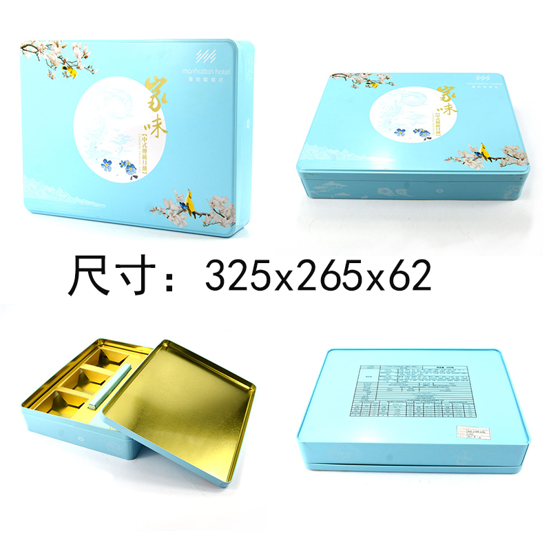 這款長方形月餅鐵盒采用一級馬口鐵制作,盒子上定制的品牌文字/LOGO進行3D雕刻處理。其尺寸是:324*245*62 mm.厚度是0.23mm.同時,月餅 鐵盒子單面進行專色印刷,以綠色為主色調(diào),其外部再過光油處理,內(nèi)部可選擇過透明油;能夠有效防止鐵盒生效;月餅鐵盒塔配毛絨吸塑材質(zhì)的內(nèi)托,讓產(chǎn)品的整體效果更好;內(nèi)托材質(zhì)可以自由選擇,內(nèi)托的材質(zhì)有:PVC,EVA,海綿等等,材質(zhì)不同價格也不同。這款月餅盒的起訂量是3000個,我司現(xiàn)有模具,現(xiàn)在訂購可以大大減低你的訂購成本。