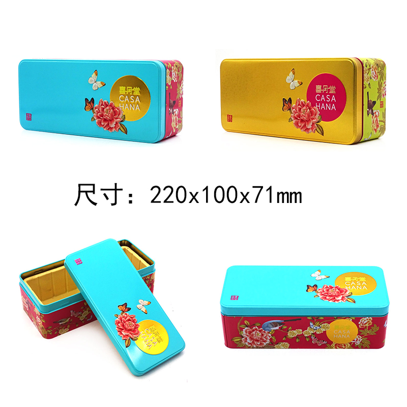 這款長方形蓮蓉月餅鐵盒采用食品級馬口鐵制成,其具有良好的延伸性和氣密性,以及抗壓性;能夠很好的包裝內(nèi)容物。尺寸是220x100x71mm;材質(zhì)厚度是0.23mm,盒子起訂量是3000個,盒型是現(xiàn)有模具,現(xiàn)在訂購大大降低你的訂購成本。